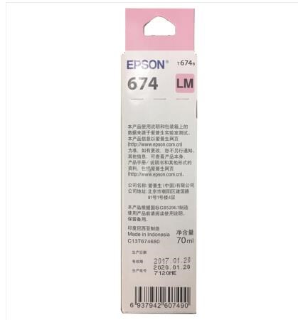 • 商品名称:爱普生(Epson)T6746浅洋红色墨水补充装 C13T674680(适用于L801)